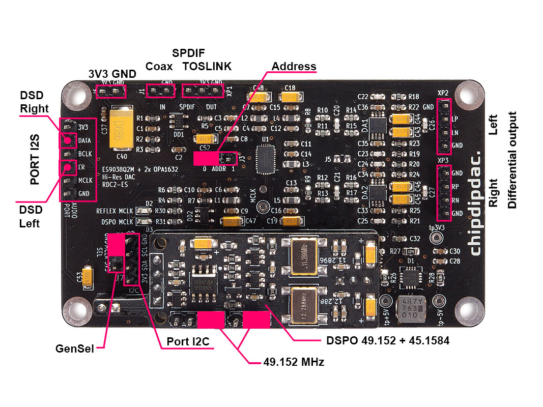 включенном на максимальную частоту 49.152 МГц. С генератором DSPO 49.152 + 45.1584 в асинхронном режиме максимальная производительность ES9038Q2M - 32бит/192кГц в PCM или DSD256. С генератором DSPO 100.000 в асинхронном режиме максимальная производительность ES9038Q2M - 32бит/768кГц в PCM, DSD256via DoP или native DSD512